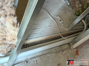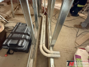 Attention to detail in this phase was essential. Conduits were installed in a manner that minimised the risk of audio bleed-through, which can occur if cables run directly between rooms. To counter this, the conduits linking the live room and control room were installed in a zigzag pattern rather than in a straight line. This method reduces direct pathways for sound transmission. Once tested, these conduits were sealed to further enhance insulation.