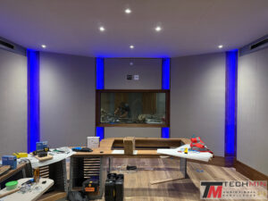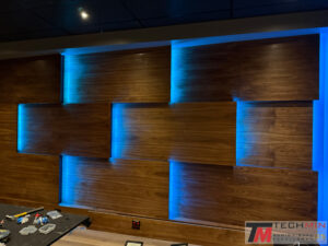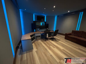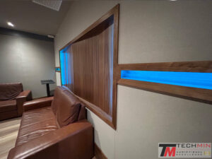For this build, the studio designer introduced a change to the LED lighting profiles we typically use. Instead of the usual channelling, corner profiles were installed. This adjustment created a softer and more even reflection of light against the wood panels of the enclosures. The result was both functional and visually appealing, delivering high-quality lighting that enhanced the aesthetic of the space.