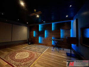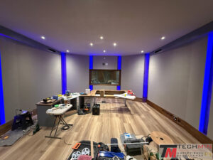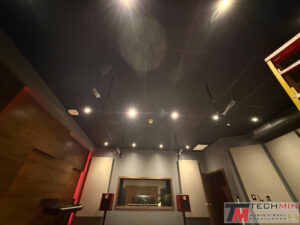 Future-proofing was another key consideration in this build. The studio was made Dolby Atmos ready, with all necessary cabling installed to support both active and passive speaker configurations for surround sound. Outlets for floor-level surround speakers were integrated into the power skirting, while ceiling panels were fitted with cables for height channels.
