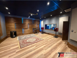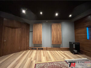 The back wall of the live room was fitted with swingable acoustic panels. This design allowed the wall to function in two modes—either as an acoustically absorbent surface or as a reflective one. The flexibility provided by these movable panels gave the client the ability to adapt the acoustics of the room depending on the recording requirements, whether for vocals, instruments, or larger ensembles.