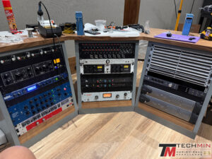 In consultation with the client, a new desk was designed to provide both a sleek appearance and practical functionality. The desk offered sufficient space for all the necessary connections to and from the patch bays, while maintaining a clean and professional finish. One particularly innovative element was a 3D-printed rack created specifically for the Mac Studio, ensuring that even the smallest details of the workspace were carefully considered.