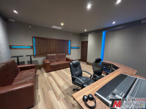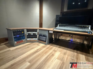 The desk was brought to life by Wood by Design, whose craftsmanship gave the control room a polished yet spacious atmosphere. This space was built not only for functionality but also for comfort, as control rooms often serve as the creative hub where artists, producers, and engineers spend long hours working.