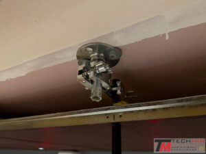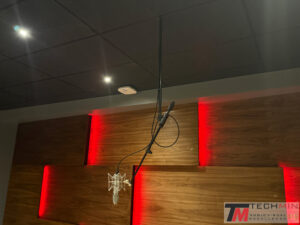 One unique request from the client on this build was the installation of overhead microphones in the live room. Initially, the plan was to add microphone points against the ceiling. However, this concept evolved into a more practical and visually pleasing solution. Heavy-duty Samson microphone boom stands were mounted using Gibraltar drum cymbal clamps, which were securely attached to the upper ceiling panels.
