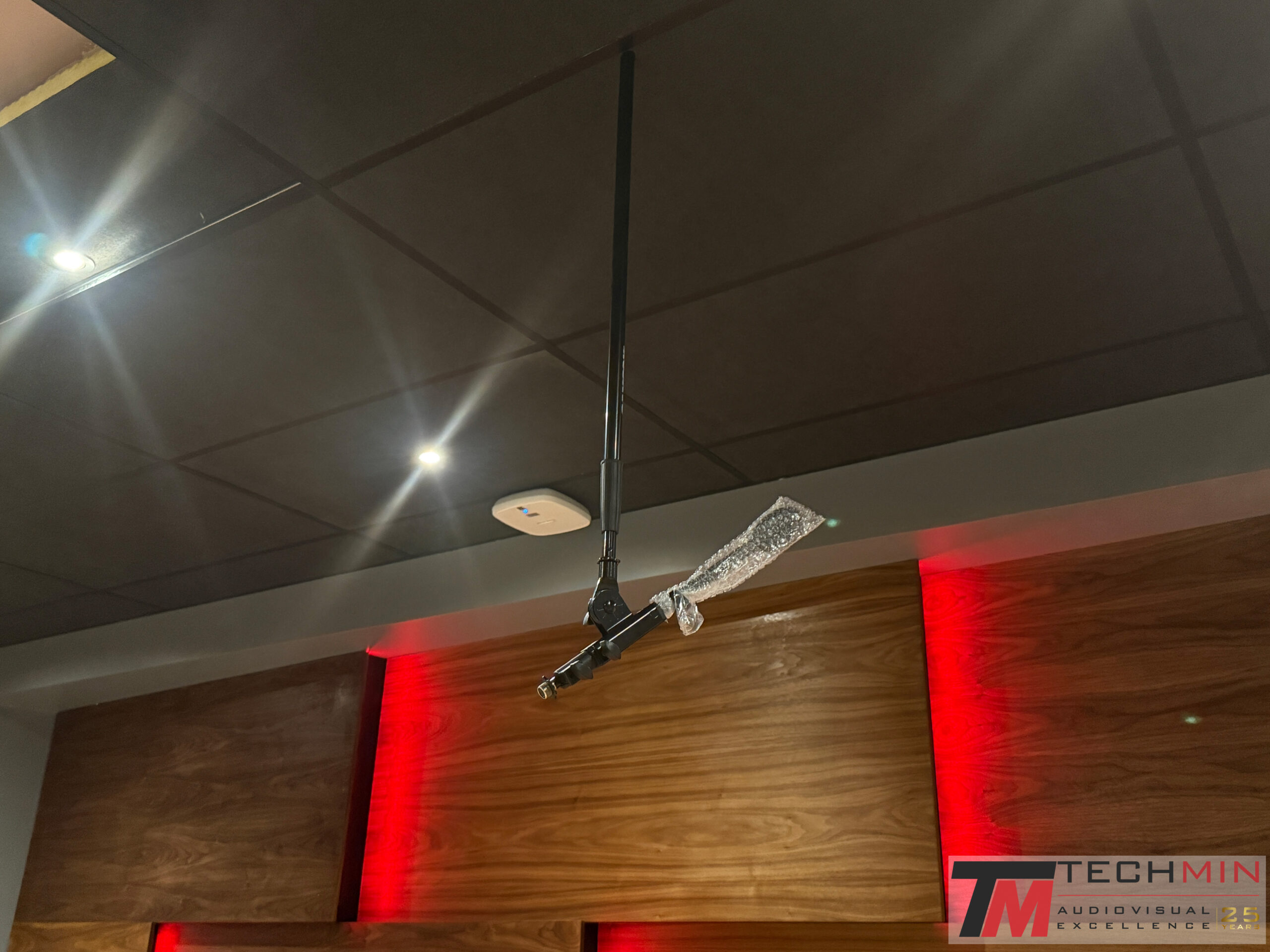 One unique request from the client on this build was the installation of overhead microphones in the live room. Initially, the plan was to add microphone points against the ceiling. However, this concept evolved into a more practical and visually pleasing solution. Heavy-duty Samson microphone boom stands were mounted using Gibraltar drum cymbal clamps, which were securely attached to the upper ceiling panels.