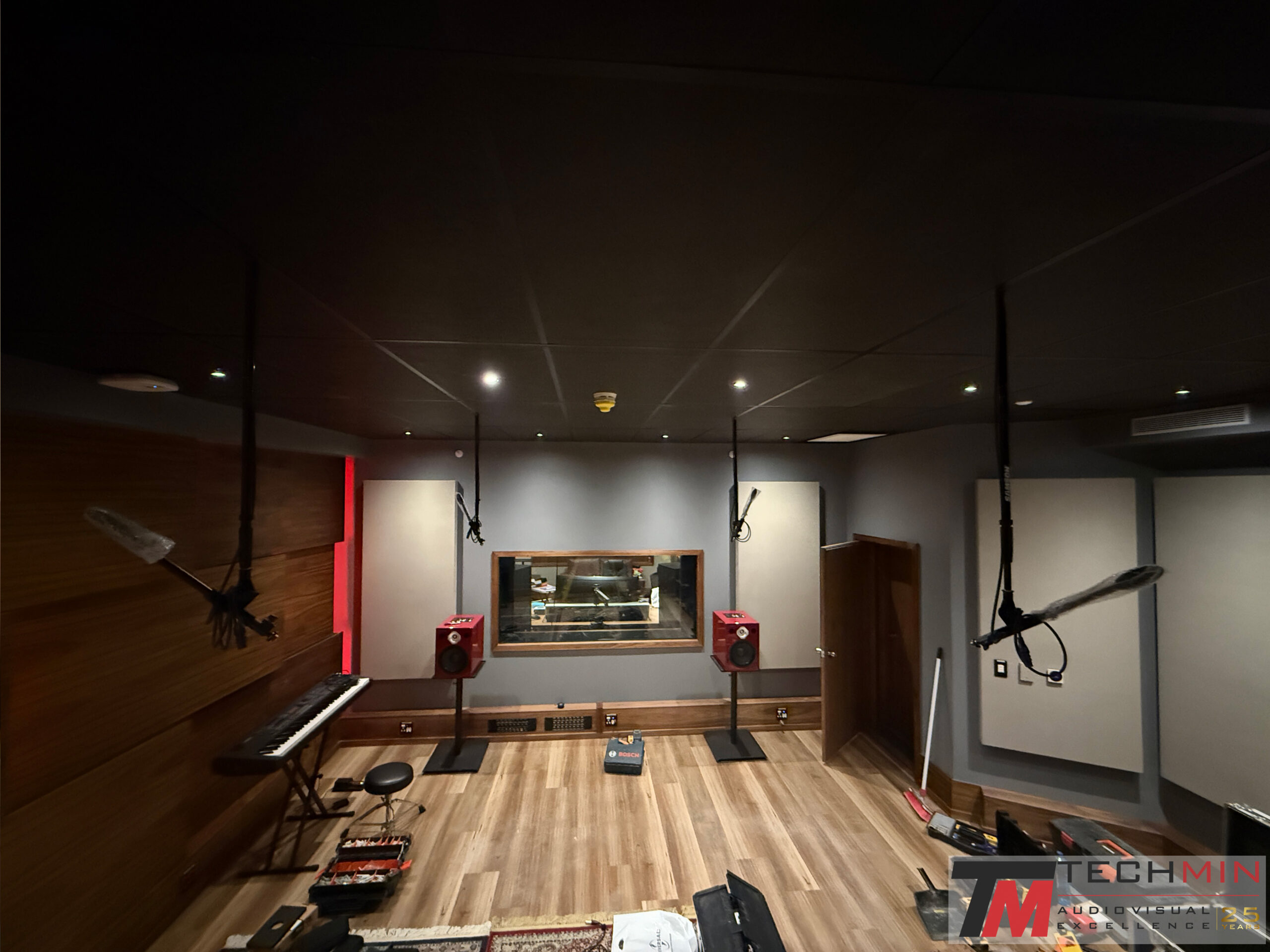 The back wall of the live room was fitted with swingable acoustic panels. This design allowed the wall to function in two modes—either as an acoustically absorbent surface or as a reflective one. The flexibility provided by these movable panels gave the client the ability to adapt the acoustics of the room depending on the recording requirements, whether for vocals, instruments, or larger ensembles.
