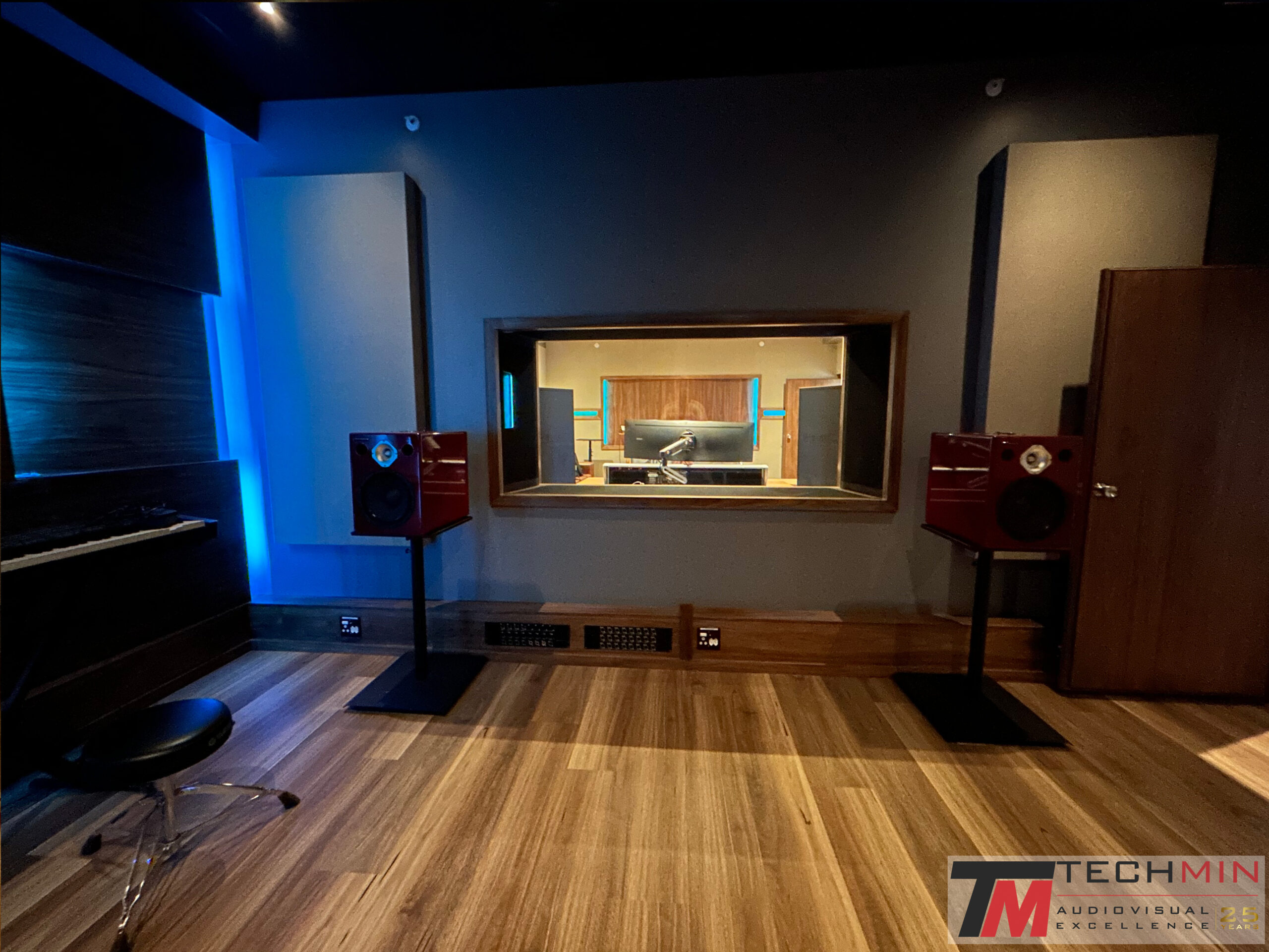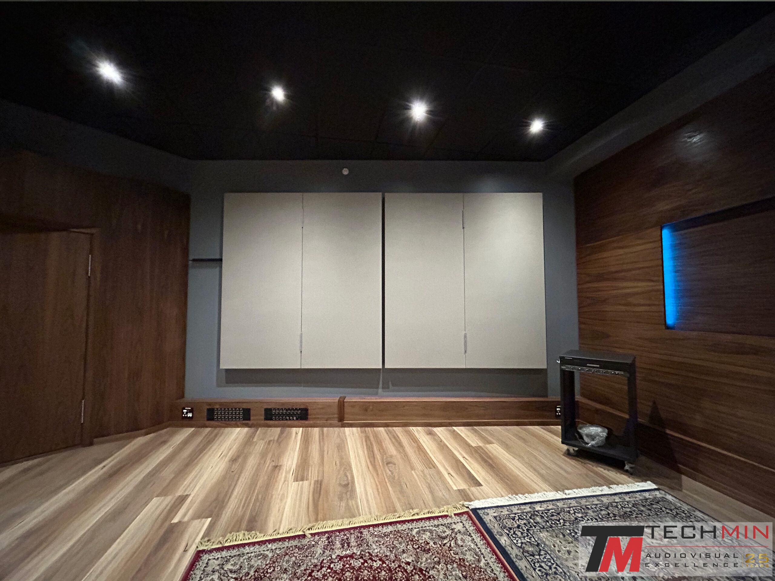Future-proofing was another key consideration in this build. The studio was made Dolby Atmos ready, with all necessary cabling installed to support both active and passive speaker configurations for surround sound. Outlets for floor-level surround speakers were integrated into the power skirting, while ceiling panels were fitted with cables for height channels.