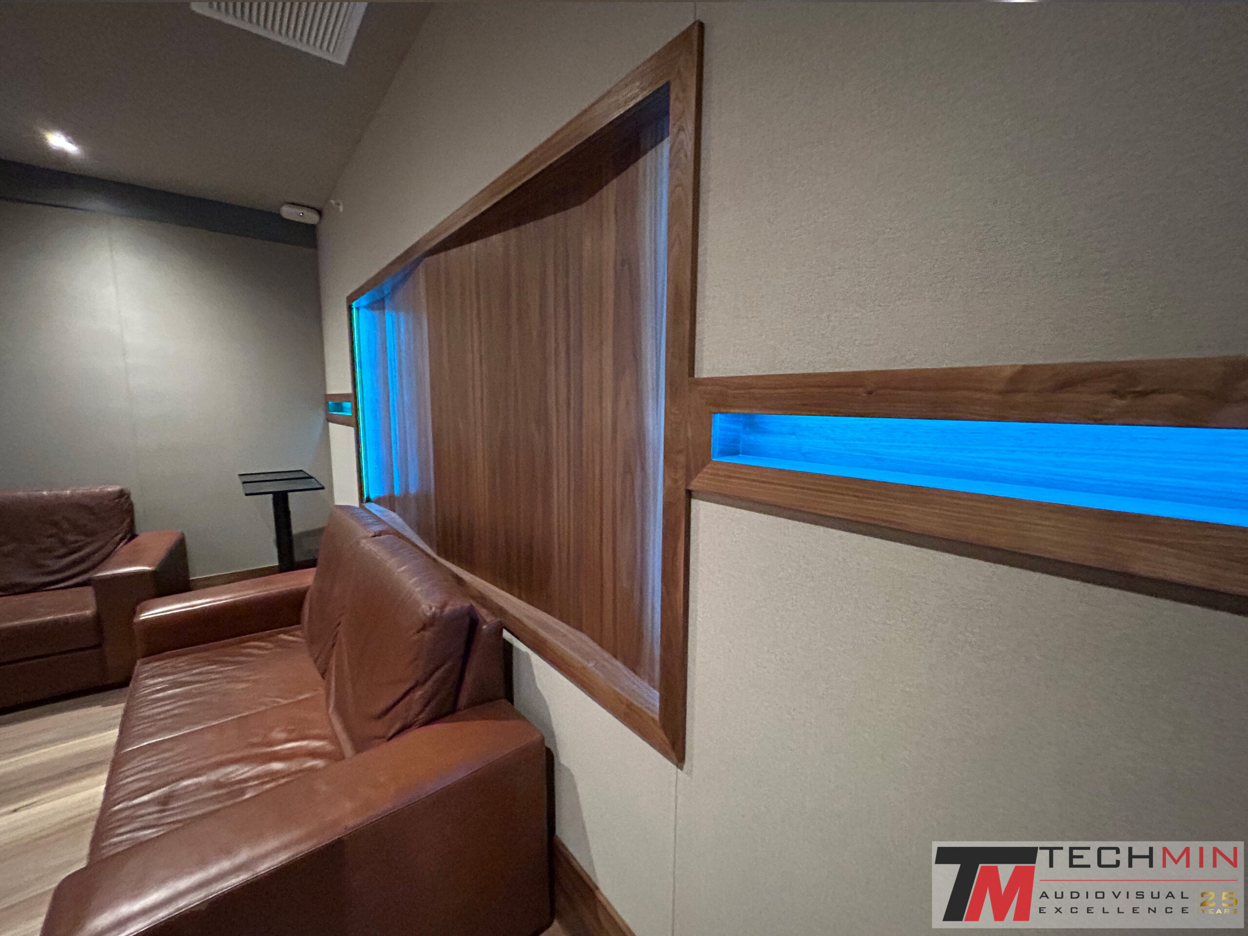 For this build, the studio designer introduced a change to the LED lighting profiles we typically use. Instead of the usual channelling, corner profiles were installed. This adjustment created a softer and more even reflection of light against the wood panels of the enclosures. The result was both functional and visually appealing, delivering high-quality lighting that enhanced the aesthetic of the space.